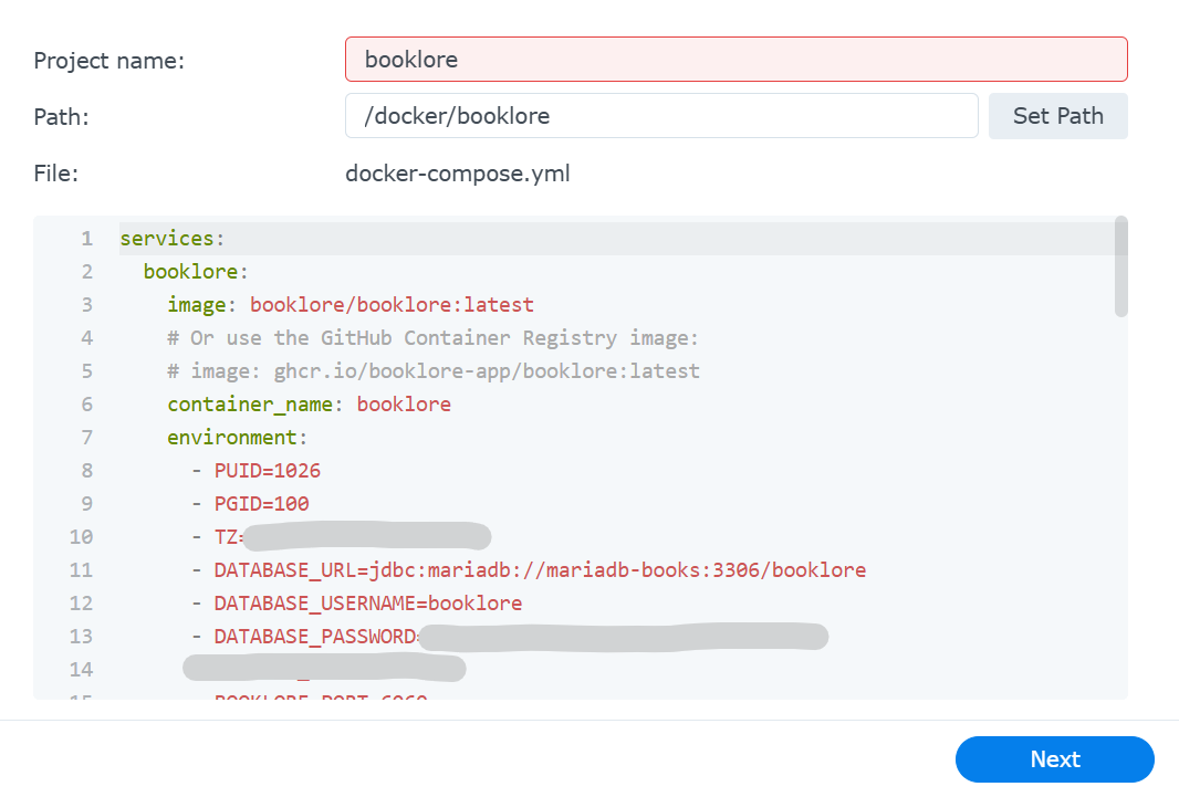 Give your project a name (booklore in our case) and then Set Path to find the directory we created earlier that has your docker-compose.yml file. When selecting the directory, it will ask you this